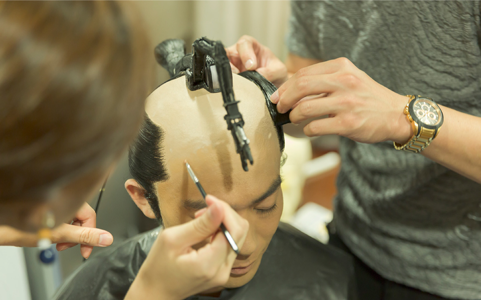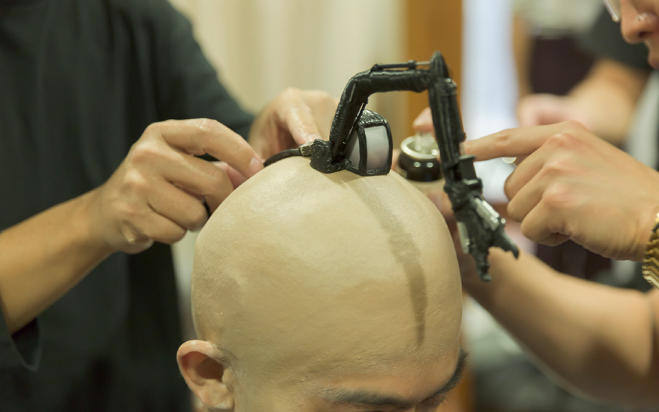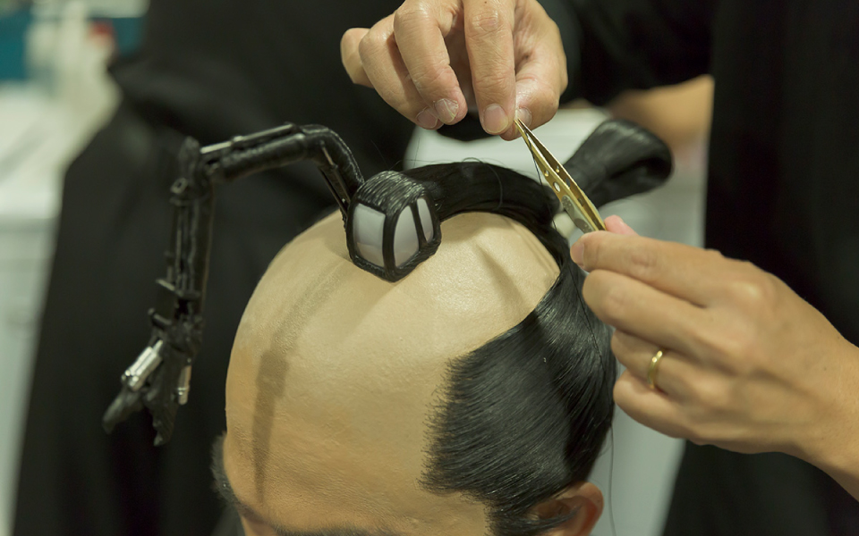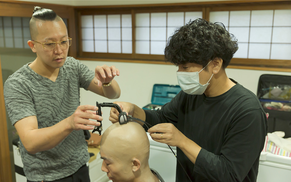 • サイドの髪に、キャタピラーを装着!重機を忠実に髪の毛で再現していきます。